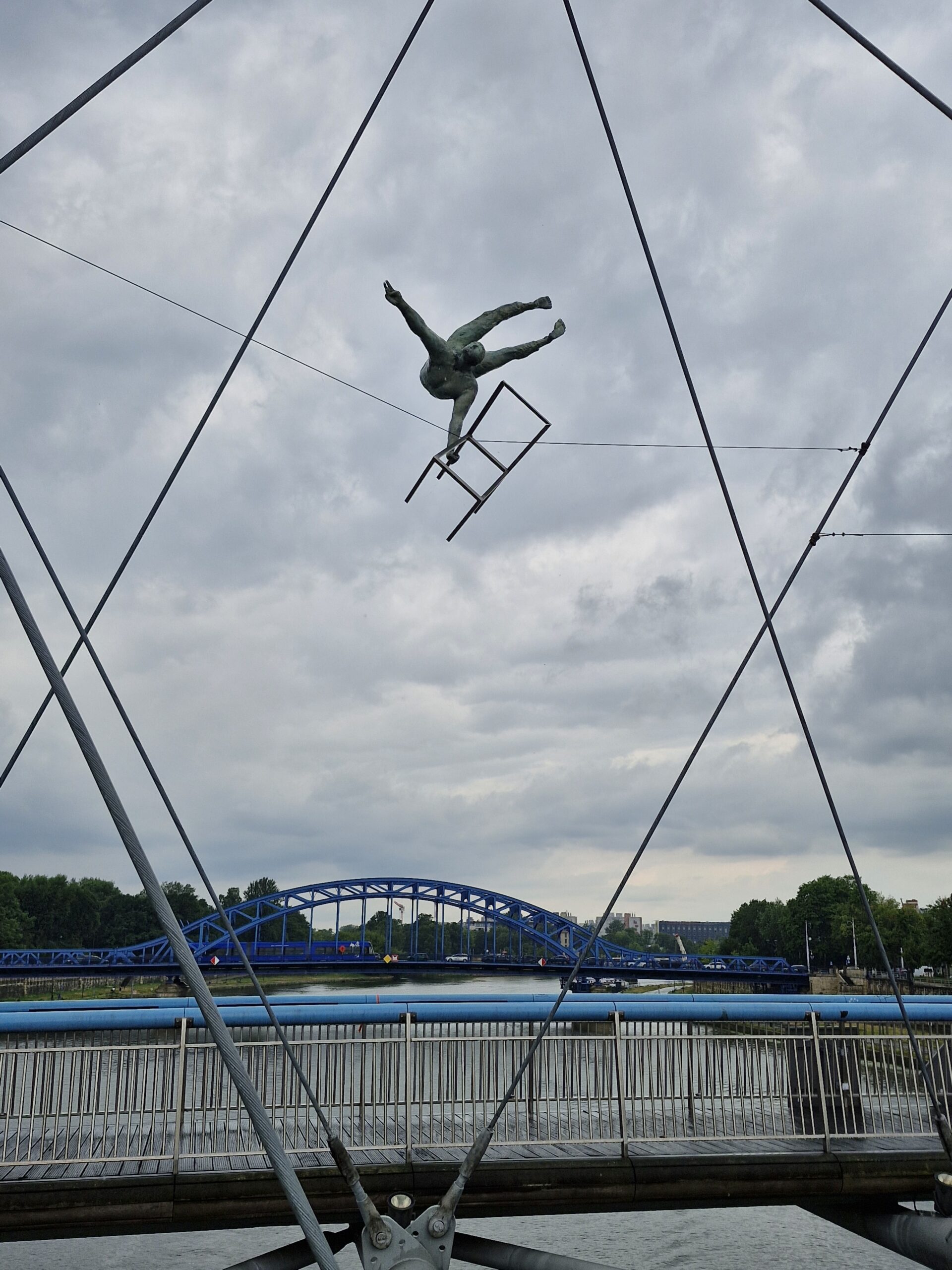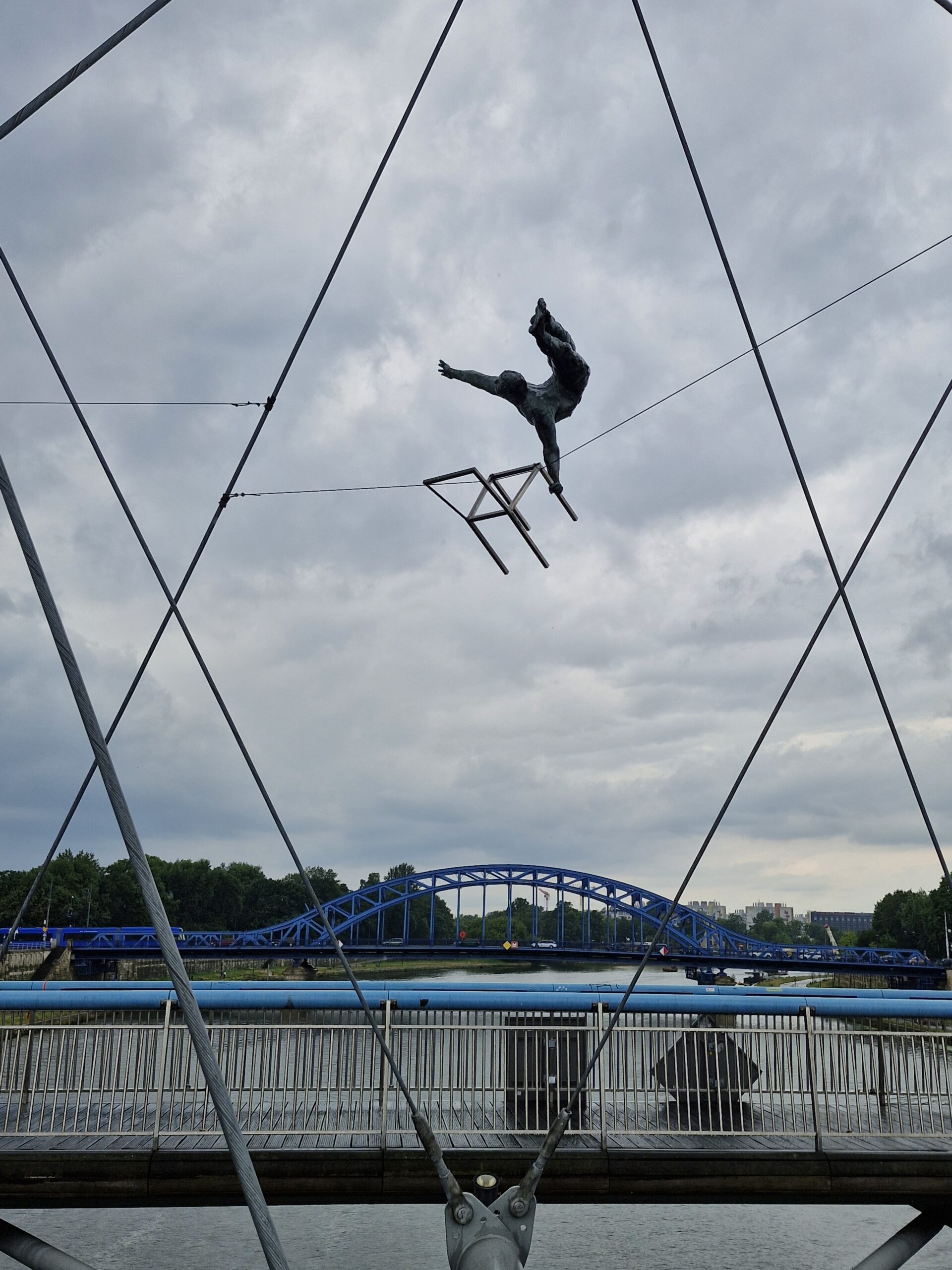 Beim Betrachten der Skulpturen von der Brücke aus entsteht eine Doppelung. Die Betrachter*innen können ein Gefühl der Unsicherheit in der Höhe über dem Fluss wahrnehmen und sind damit näher an der möglichen Empfindung der Hochseilartisten. Bei einer Betrachtung derselben Skulpturen vom sicheren Standpunkt etwa in einem Museum oder einem Park wäre das nicht möglich. Darüber hinaus scheinen die Figuren über der Silhouette der Stadt zu schweben und die Betrachter*innen mit ihnen.